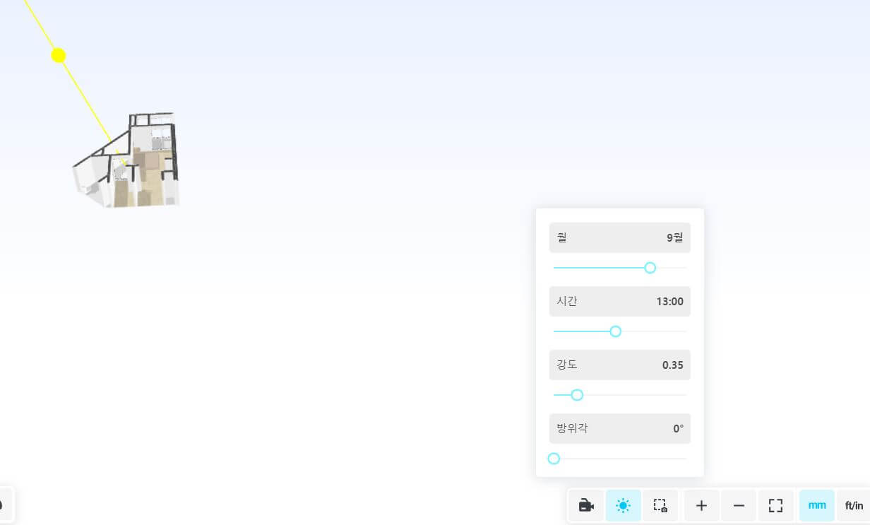 3D 버튼 중 일인칭 뷰어를 누르면 사용자가 보는 시선으로 바뀝니다. 마우스로 도면을 클릭하여 내가 원하는 곳을 360 º로 볼 수 있습니다.