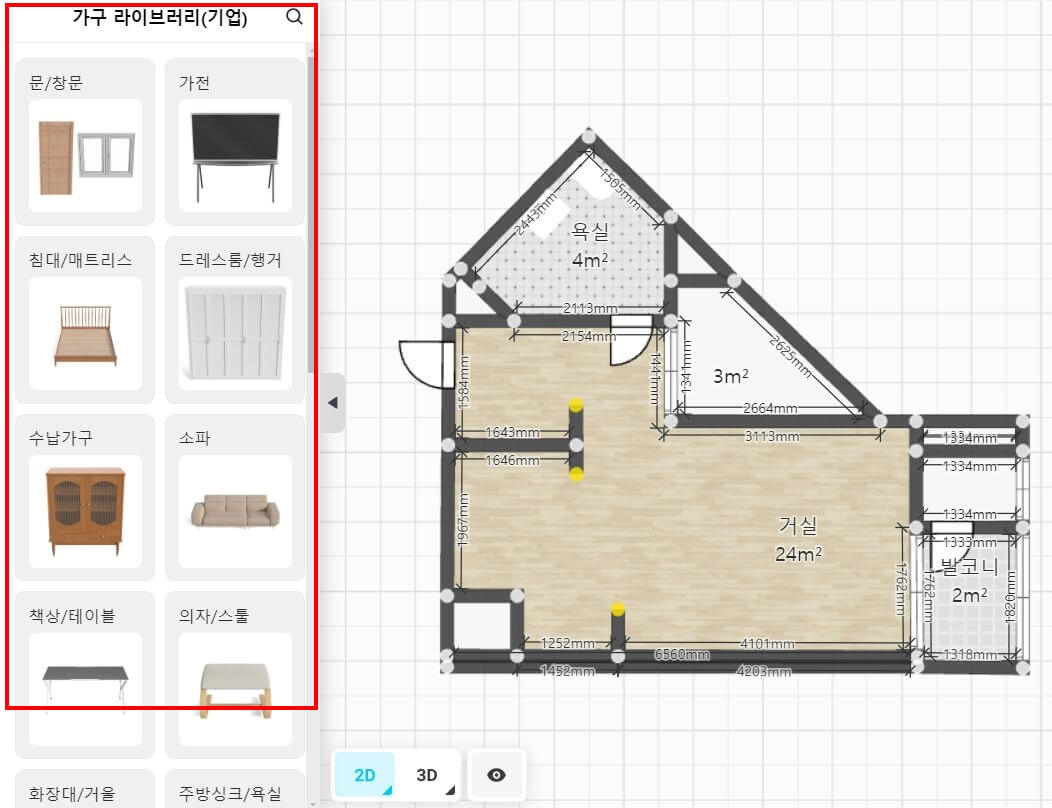전체적인 뼈대를 잡았다면 가구를 배치하시면 됩니다. 가구는 각 섹션별로 나누어져 있습니다. 원하시는 가구를 클릭합니다.