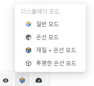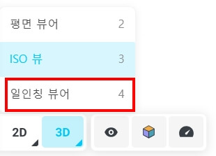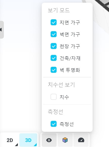 2D, 3D 이외에도 도면 모드를 일반으로 볼 것인지 은선모드로 볼 것인지 조절할 수 있고, 벽을 투명화하여 가구만 보는 등 보기 모드를 조절할 수 있습니다.