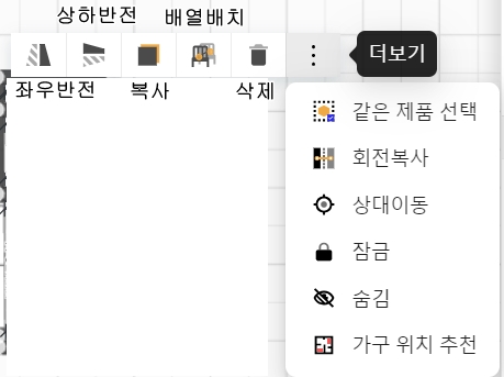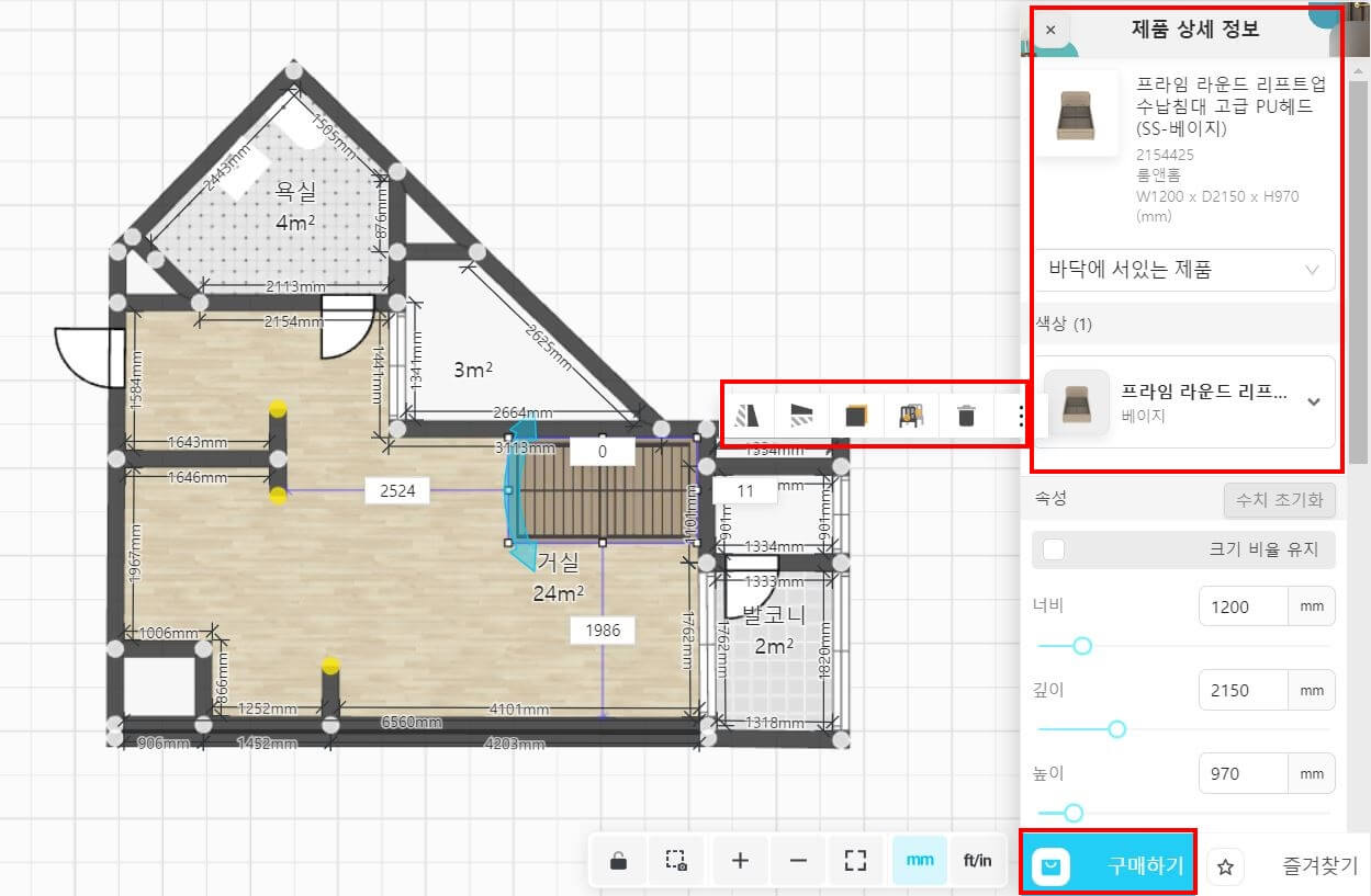 원하시는 가구를 찾았다면 적절한 곳에 배치한 뒤, 상하반전이나 좌우반전을 할 수 있습니다. 또한 제품 상세 정보가 우측에 뜨기 때문에 정확히 어떤 제품인지 알 수 있습니다. 만일 제품이 마음에 드신다면 우측 하단에 구매하기를 할 수 있습니다.