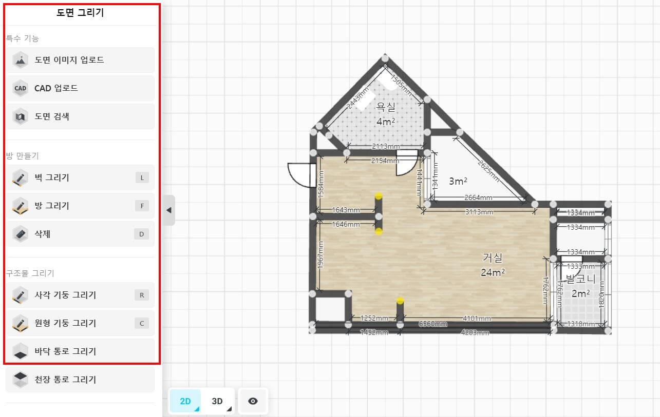 왼쪽을 보면 벽을 그리거나 벽을 삭제하는 등의 기능이 있습니다. 사용자의 편의에 따라서 그리고 지우기를 하시면 됩니다.