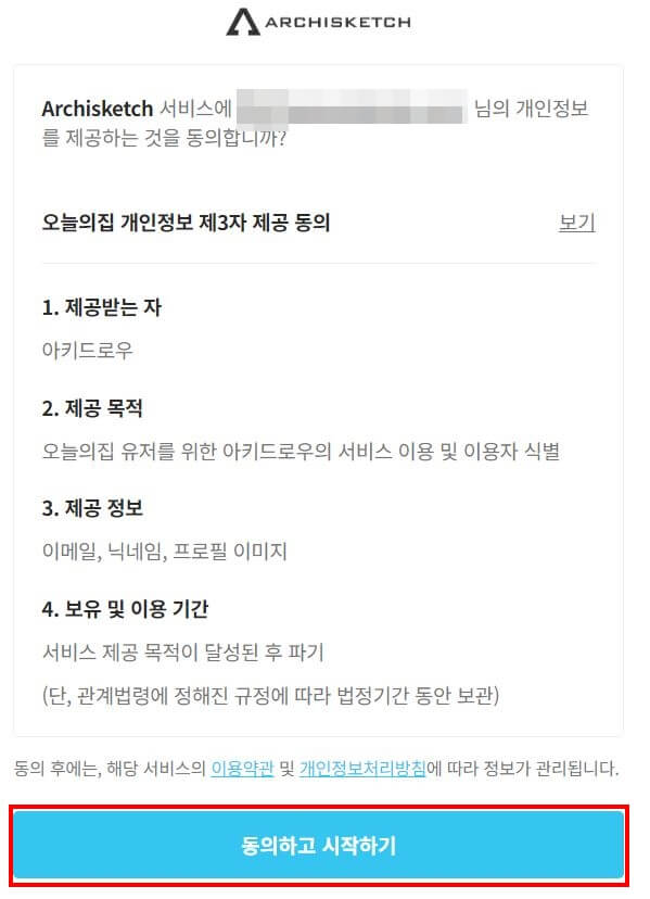 아키스케치 약관에 동의하고 시작하기를 클릭합니다.